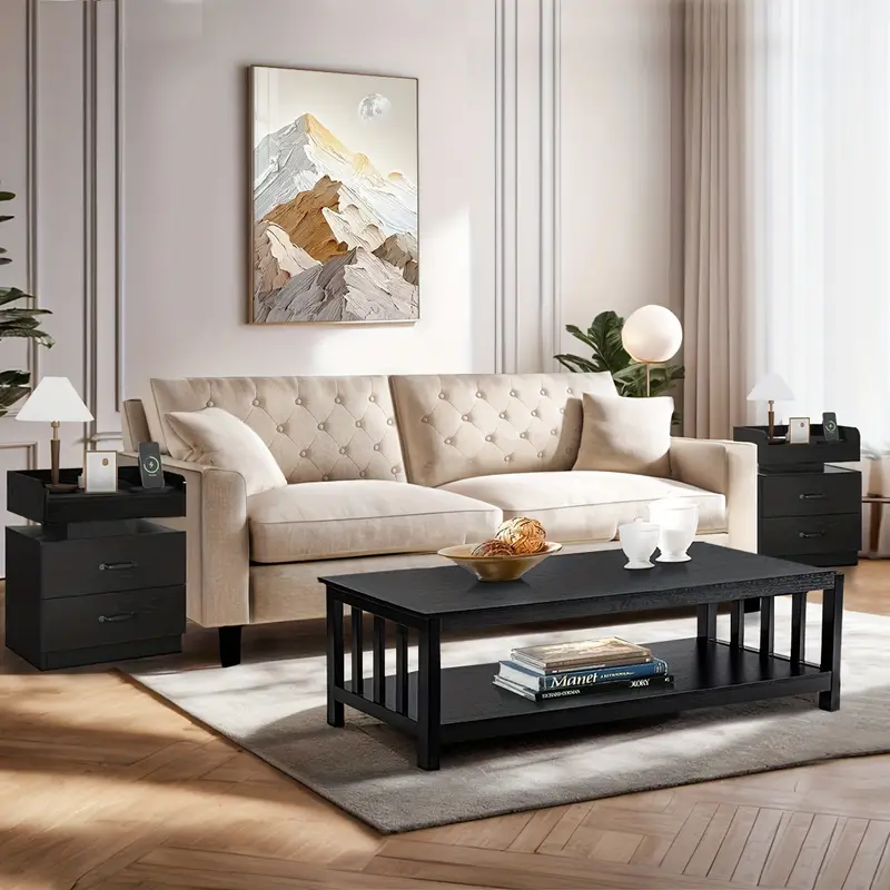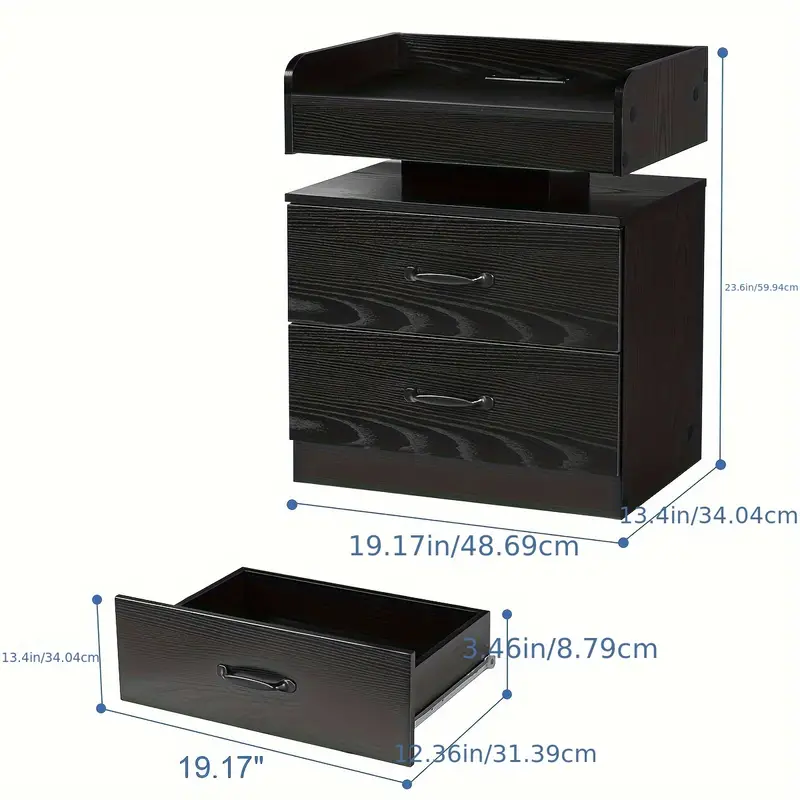 Crafted from high-quality wooden materials, this nightstand is durable and sturdy, ideal for holding bedroom essentials like lamps, books, and personal items. Its spacious drawers offer generous storage to keep your space organized, while the sleek black finish enhances its elegance and versatility, blending seamlessly with a variety of interior styles. Whether used as a bedside table or an end table, this modern nightstand combines style, storage, and technology to bring both convenience and charm to your living spaces.
