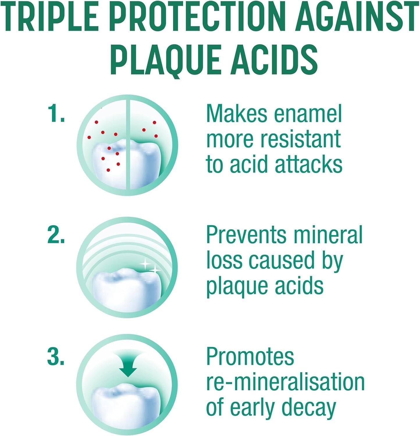 • Contains fluoride to make enamel more resistant to acid attacks, prevent mineral loss and promote remineralisation of early decay
