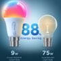 - Bright and Easy to Install: The 800LM smart bulb can provide ample light for indoor rooms and work areas, warm light 2700k – cold light 6500k, with only 9W of power without losing brightness or color quality. Simply screw in the smart bulb and connect to the App for smart lighting control.