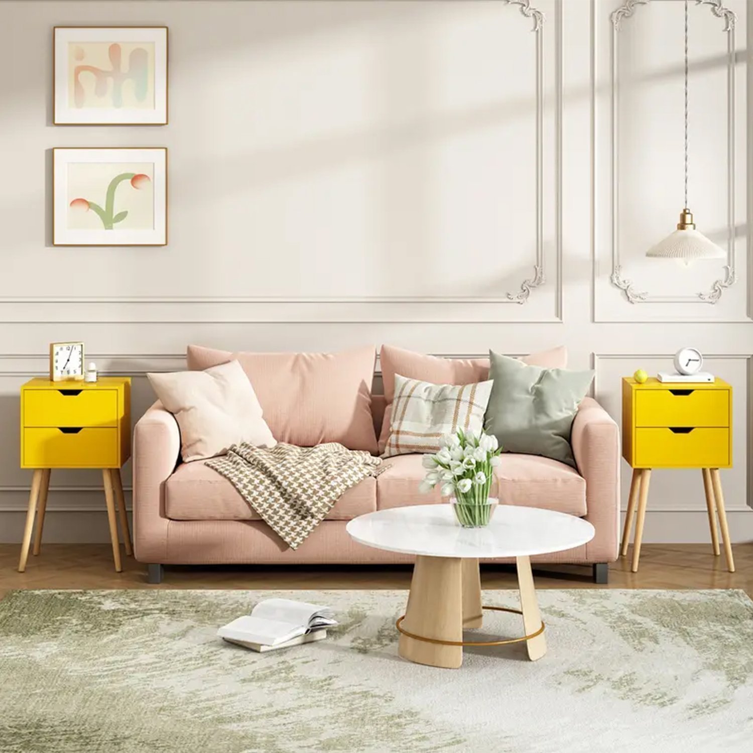 Upgrade your living spaces with this set of two nightstands, each featuring two drawers for a blend of style and storage. Designed with durable hardwood and wood-based panels, these nightstands bring both elegance and function to your home, making them perfect additions to any bedroom or living room. The tables are scratch-resistant, ensuring long-lasting quality, while the sturdy solid wood legs provide enhanced stability, supporting over 30 pounds of weight.