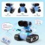 Introducing the SGILE Remote Control Smart RC Robot Toy, designed for kids aged 3 to 7. This delightful robot features a charming LED-eyed upper body with flexible head and arms, paired with tank tracks for smooth movement and fun spins. It sings three songs, performs 360-degree dances, and its LED eyes can be controlled to light up, blink, or close. The robot is easily operated with a 2.4GHz remote controller, offering forward, backward, and turning motions. Rechargeable with a 300mAh lithium battery, it provides up to 150 minutes of playtime on a single charge, perfect for hours of entertainment.